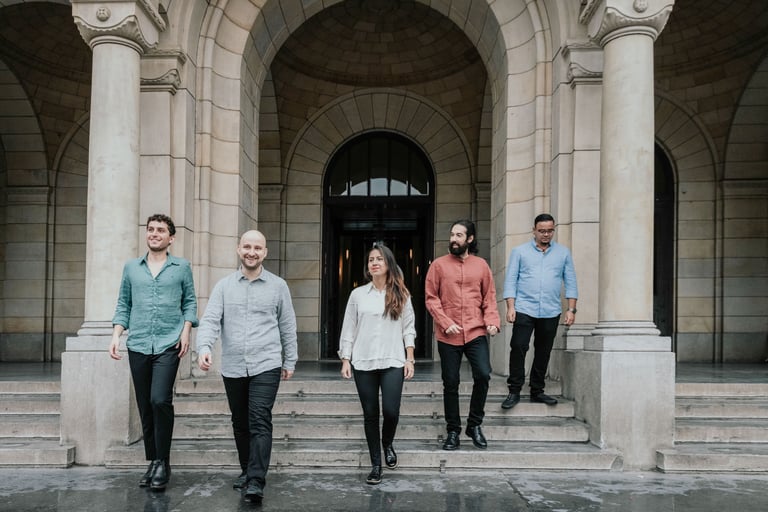 Vijf muzikanten, één ritme. De groep "Cinco en Clave" combineert de perspectieven van vijf verschillende culturen en talen om een iriserend beeld te schetsen van hun passie: Latijns-Amerikaanse muziek. De bandleden leerden elkaar kennen aan het Codarts Conservatorium Rotterdam, waar ze hun invloeden samenbrachten, variërend van Cubaanse en Antilliaanse muziek tot westerse klassieke muziek en jazz. Hun spel laat elke stem afzonderlijk schitteren door te componeren, arrangeren en improviseren, vermengd in een levendig ritme, of het nu gaat om opzwepende Latin jazz, elegante danzón of sensuele bolero. Cinco en Clave zijn een Latin-jazzkwintet dat zich beweegt van eigen composities tot frisse arrangementen van Latin jazz standards. Als ze zeggen dat er muzieksoorten zijn die het lichaam raken, naast het hart of de geest, dan raken ze die allemaal. Ze streven één ding na: zoeken naar melodieën, harmonieën en ritmes die buitengewoon mooi, maar tamelijk onbekend zijn. Lotophagos is de hit van de band. De compositie van Stefan Brunner (bassist) weerspiegelt de klassieke touch, met Latijnse groove en jazzimprovisatie door akkoorden en spontaniteit. Walkin' a Beat with a Peg-Legged Policeman, gecomponeerd door hun eerste leraar Thomas Böttcher, heeft een 7/4 clave, waarbij je je geraakt voelt door een eigentijdse touch. Of Un Domingo, een langzame danzón gecomponeerd door Evelyn Vera Gallardo (pianiste), favoriet bij liefhebbers van elegantie.